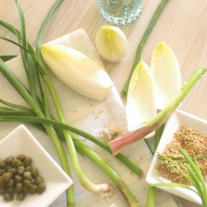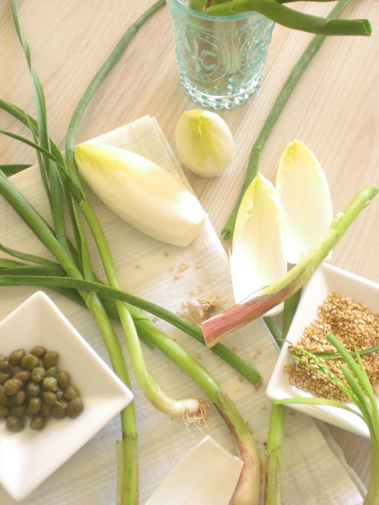 Limpiar los ajos tiernos y las hojas de endivias. Pasar por una plancha caliente para que cojan color y calor.