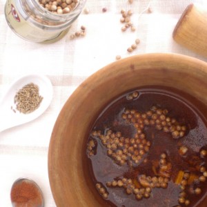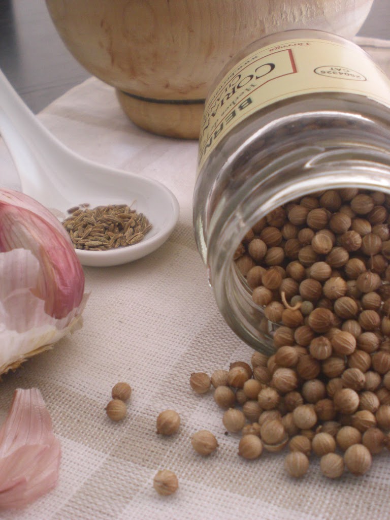 Mientras, hacer la mezcla de especies con todos los ingredientes y machacarlos en el mortero hasta hacer una pasta o con la batidora. Reservar.