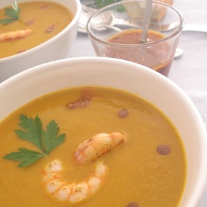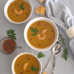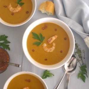 Después de la compra del otro día donde había una gran calabaza, he decidido hacer una crema con ella y algunas verduritas más, añadiendo unas gambitas rojas que le darán un toque diferente a la vez me hacen entrar en calor después del frío paseo.