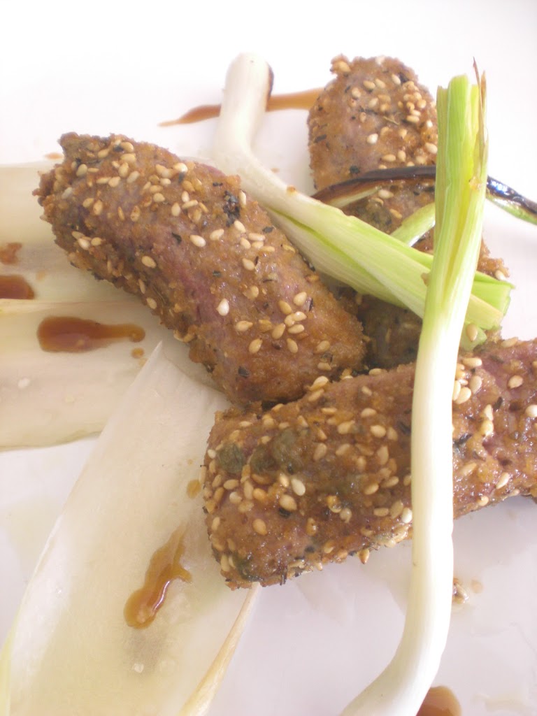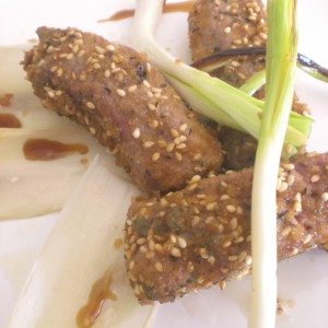 De segundo, un magret de pato rebozado con una mezcla de sésamo, alcaparras, pan rallado, soja y ajo.